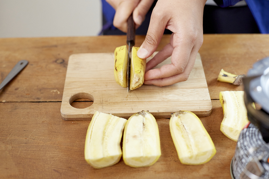 ❶バナナの皮を剥き、5㎜ほどの厚さにスライスする。