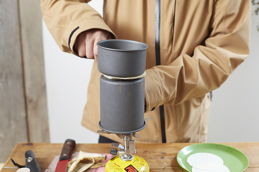 乾燥食材をお湯で戻すだけという簡単な調理法から道具はシングルバーナーと小型フライパンのみ。