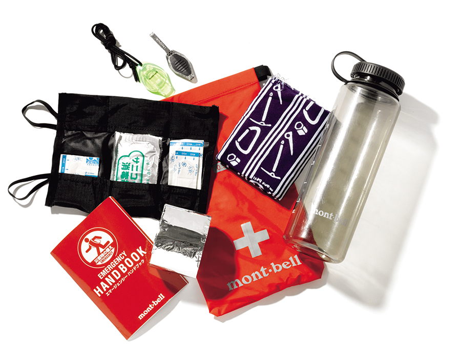 応急処置のアイテムも含む便利なセット。水筒になるボトルに、笛、LEDライト、洗浄綿、絆創膏、ファーストエイドバッグ、エマージェンシーシート、手ぬぐい、エマージェンシーブックを格納。ビギナーはこれをベースに足し引きするといい。