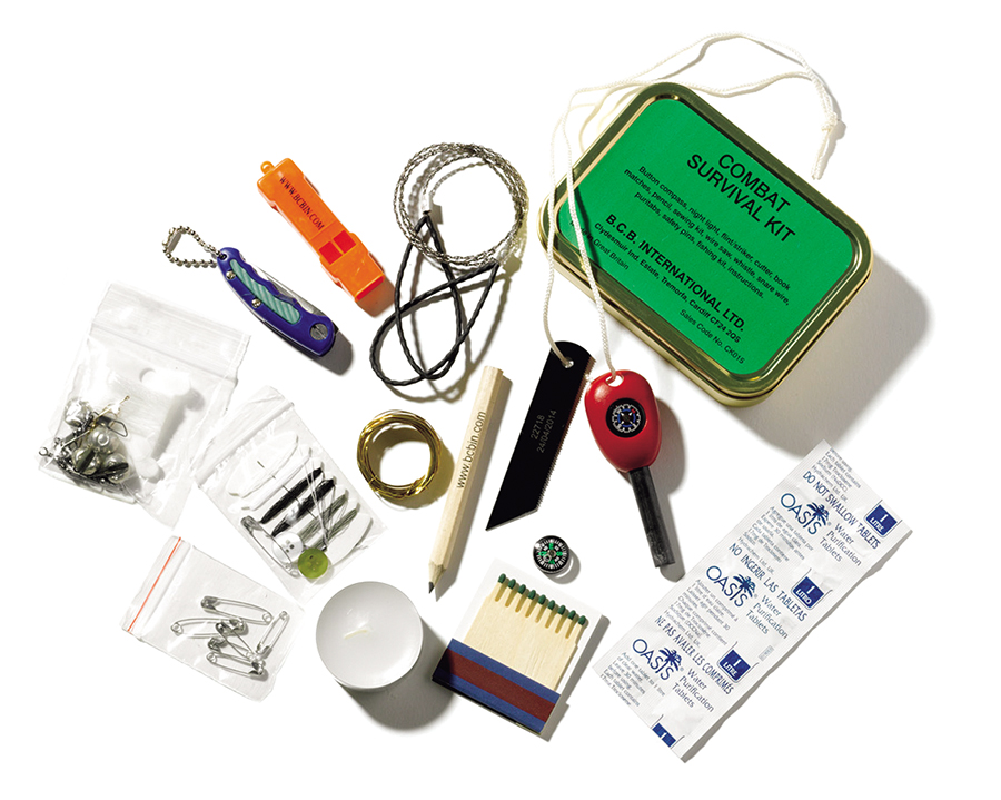 イギリス軍にサバイバルキットを納入しているブランドのミニマムキット。ブリキ製防水ケースに入っているのは、ナイフ、飲料水用の滅菌剤タブレット、釣り道具、コンパス、笛、マッチ、裁縫セット、ファイヤースチールなど。過酷な環境下で生き抜くならこれだ。