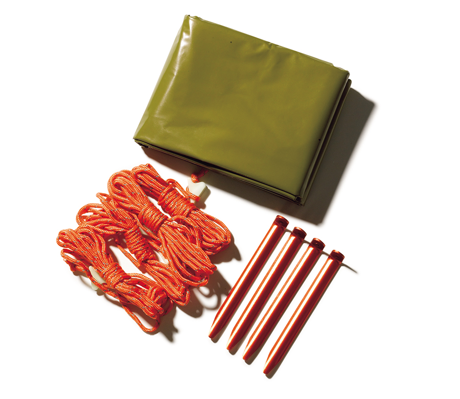 厚手のエマージェンシーブランケット、張綱&自在(4本)、ペグ(4本)のセット。ブランケット単体での使用はもちろん、シェルターを設営できるのが最大の特長。ただしループなどはないため、 張綱取り付けの際は小石を包んでから絞るなどの工夫が必要。