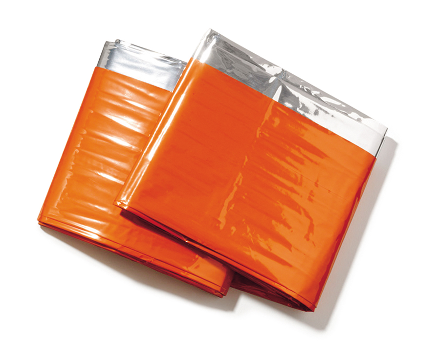 体熱の90%を反射させて体温を保持する特殊素材を使用した非常用ブランケット。緊急時に体全体をしっかり包みこめば、低体温症の予防になる。引き裂き強度が高いため、何度も使用できることに加えグランドシートとしても活躍してくれる。