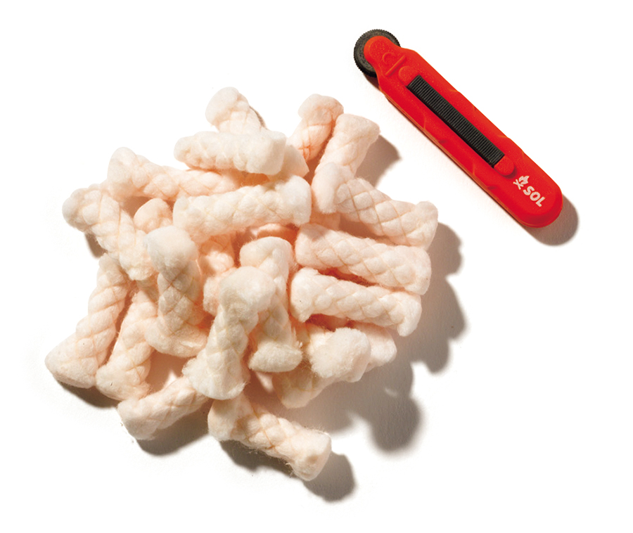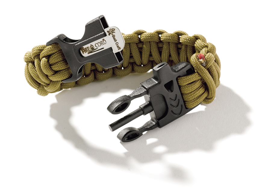 これを手首に巻いておけば、いつでもどこでも火を熾すことができる。芯に着火剤が仕込まれたパラコードを編んで作られたもので、バックル部分のメタルマッチで着火する。コードを解けば、耐荷重250㎏、 全長2.5 ~3mほどのロープに。バックルにはホイッスルも内蔵されている。