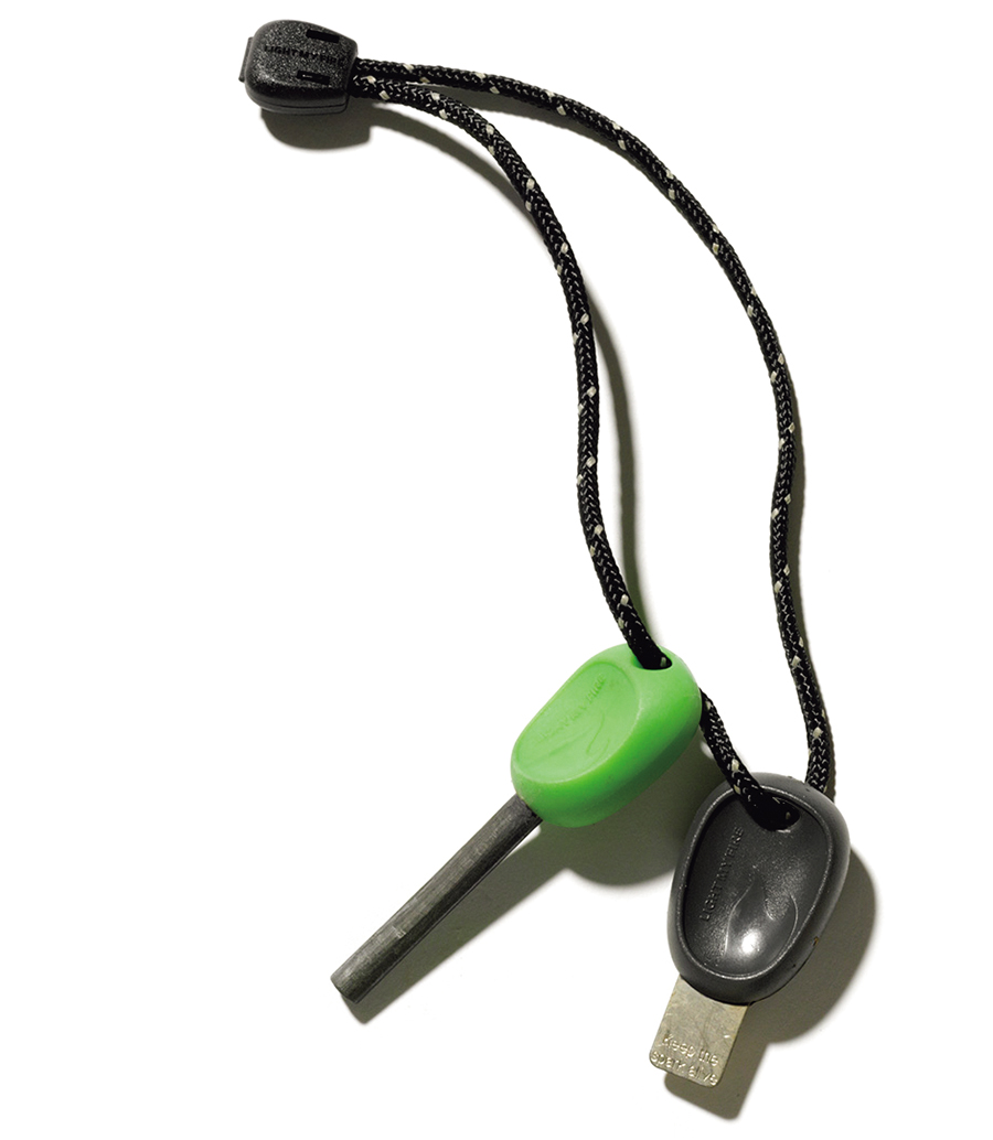 約3,000 回発火できるファイヤースターター。ライターのようにガス切れがないのでとにかく安心。マグネシウム合金製なので雨にも強い。乾燥した紙や葉、木くずなどに火花を引火させて使用する。まずは山行に出かける前に、着火練習をしてマスターしておこう。