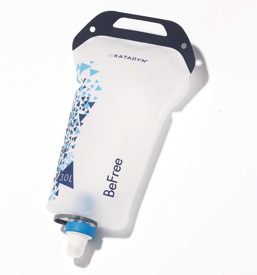 山で少し不安な生水を飲むときなどに備えると安心な、浄水機能がついたソフトボトル。水に含まれる微生物を99.9%、バクテリアを99.9999%除去する性能を備え、旅行にも最適だ。