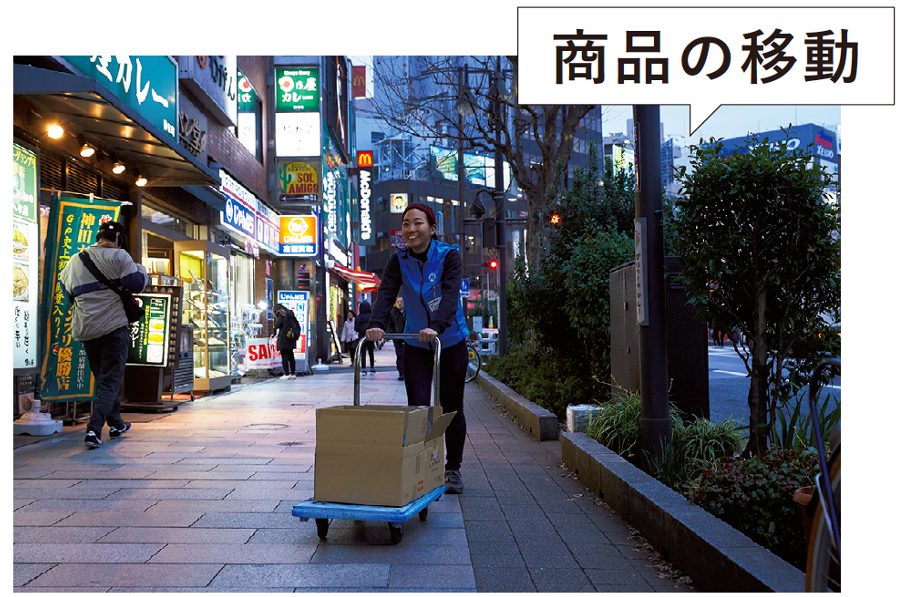 スキー用品を扱う神田本館に、在庫数が少なくなったクランポンを取りに行き、登山本店まで運ぶ。神田本館でも登山道具を多く扱う夏場は頻繁に行き来するそう。すぐそばに系列店がある店舗ならではだ。