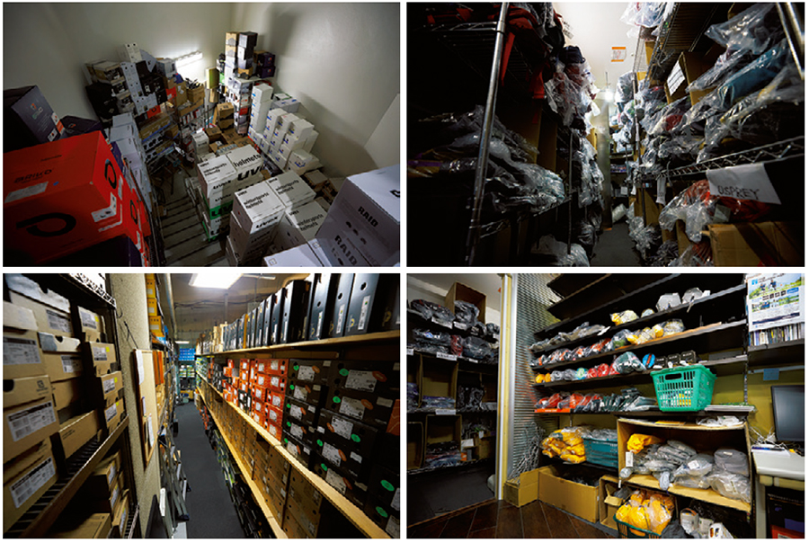 店内にいくつもあるトビラを開けるとバックヤードが出現。壁に沿って細長い空間が広がっていたり、在庫がびっしり。店頭のアイテムのそばのバックヤードに在庫がストックされている。