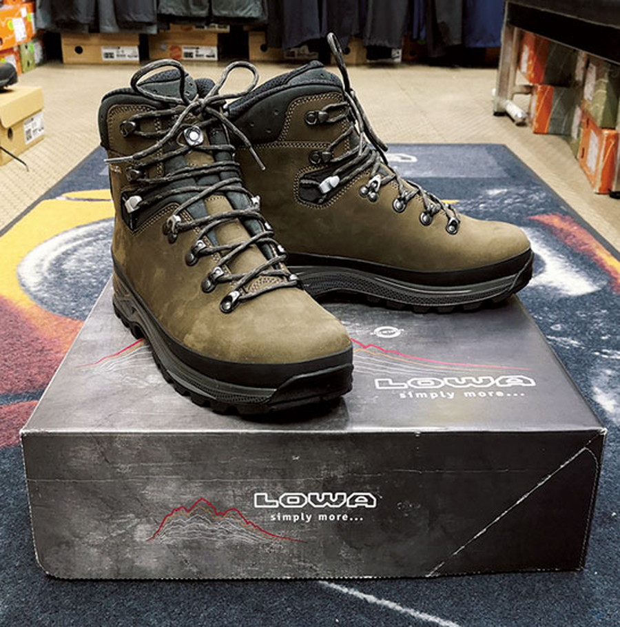 お店の意見を取り入れて誕生したローバーのタホープロⅡ・GTX。リニューアルまで2年の歳月を要した日本限定モデルもラインナップ(取材当時)。専門スタッフが靴の接客を担当。時間を掛けて登山靴を提案してくれる。