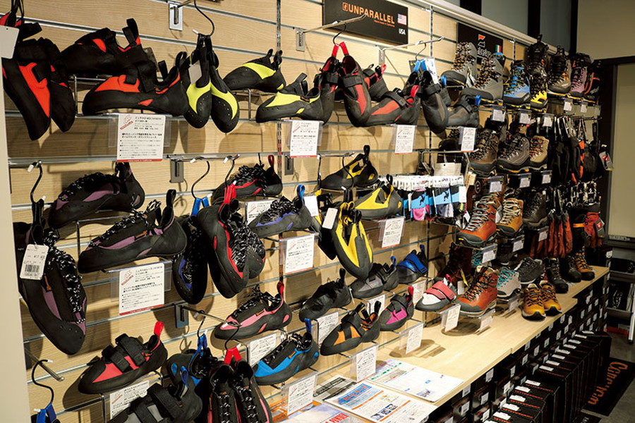 トレッキングシューズはもちろんクライミングシューズもさすがの品揃え。