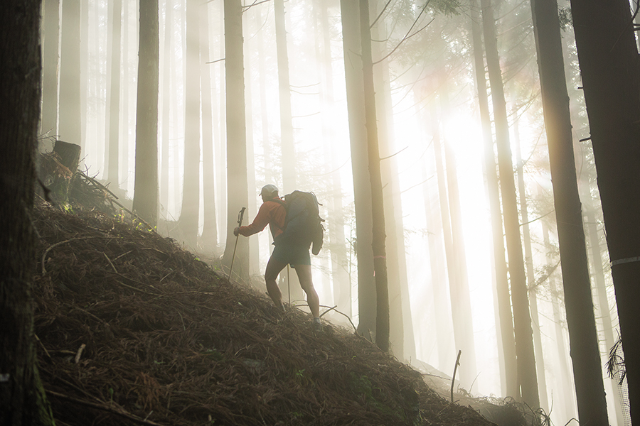 いきなり標高差1500mアップの大勝負だ。和名倉山の道標が要所要所に立てられ、迷うことなく標高をズンズン上げた。尾根の南斜面は杉の植林で、人の手が頻繁に入っているようで明るい。作業道へ迷い込まないよう、踏み跡の濃いほう濃いほうへ。キレイに枝払いされまっすぐ空へと伸びる杉林は、こちらまで背筋がピンと伸びるようだ。