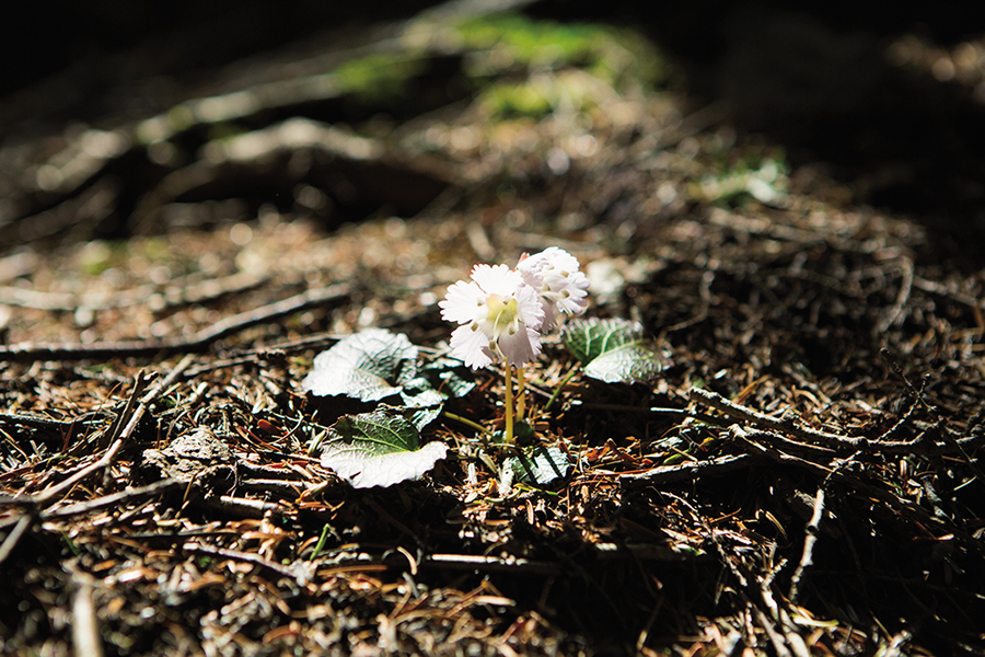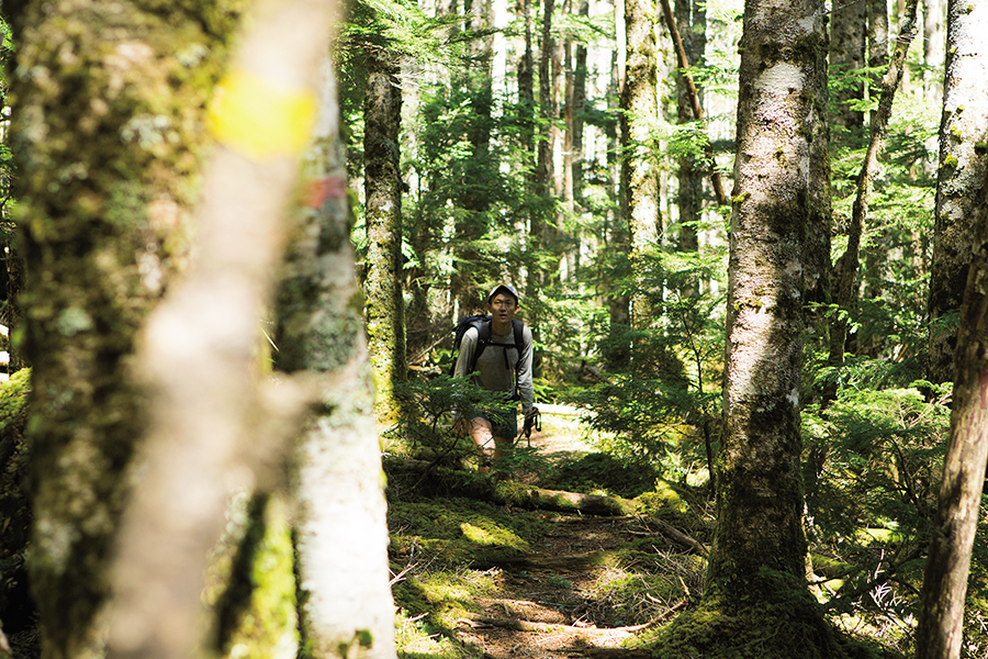 和名倉山に近づくと、コメツガやモミなどの針葉樹に囲まれ、足元には苔むした大地。おもわず深呼吸。ツガの鋭い香りが鼻孔をツンと刺激する。破線ルートにしておくにはもったいないほどの美しい森である。