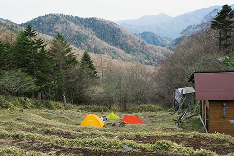 ⑤将監小屋のテント場。近年、大きなバイオトイレが設置され居心地が悪くなった。でもこの周回ルートを歩くには、ここに泊まるしかない。