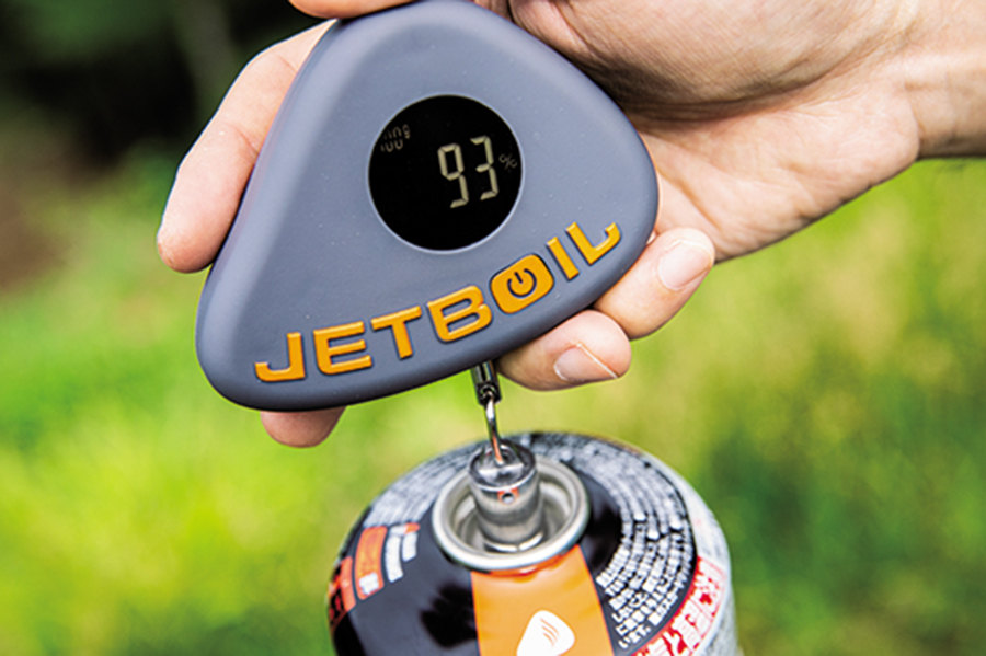 ガス残量が計れるジェットボイルのジェットゲージ。残量をパーセントで表示(重量でも表示可)。