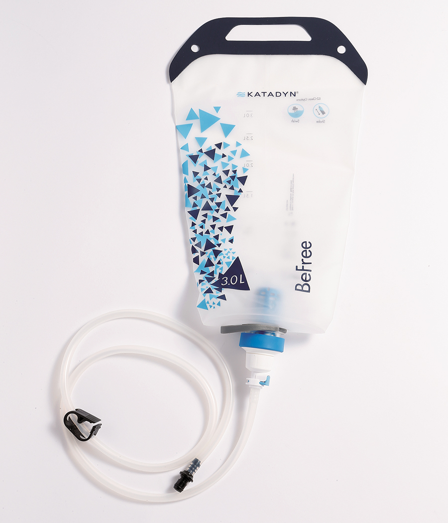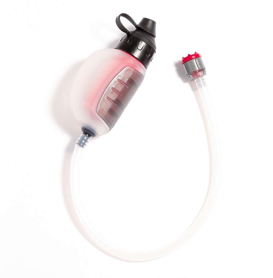 水を入れて吊るすだけで自動的に浄水ができる。本体ボトルはハイドラパックの42㎜径ソフトフラスクを使用しており、同径の市販品と付け替えが可能。