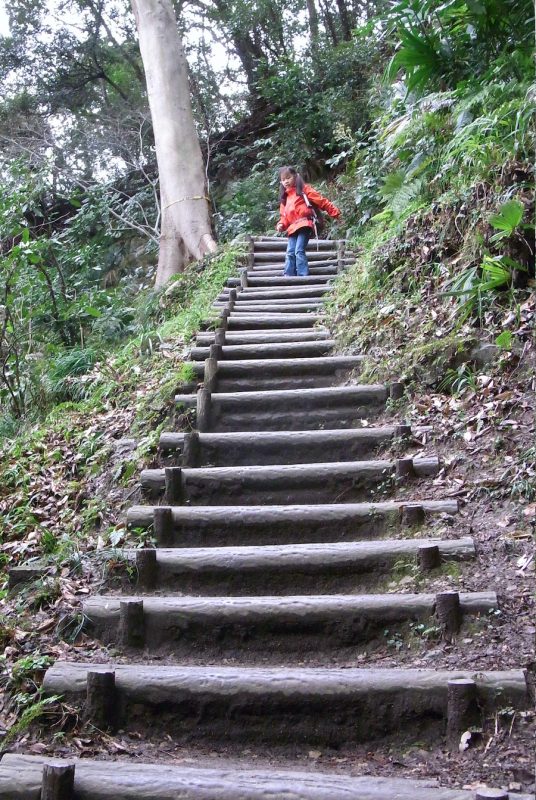 丸太やコンクリートでできた階段は、濡れていたり、靴底に泥がついていたりすると、とてもすべりやすいので注意が必要です。できるだけ、丸太の上に足を乗せないようにゆっくりと。大人が先に行くと子どもは不安になるので、手を引いてあげましょう