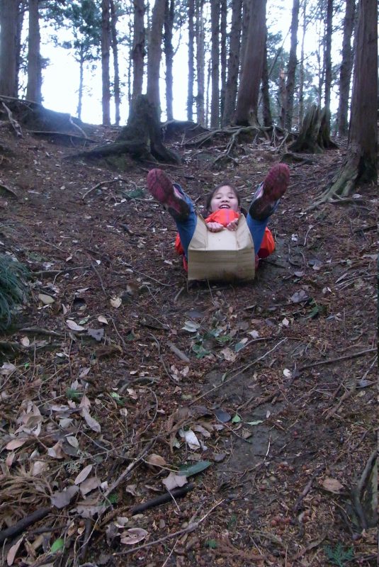 女の子の場合、ちょっと急な下りの斜面は、男の子よりも怖がってしまうものです。そんなときは、滑り台のように、おしりをついてズルズルと下った方が安全です。また、段ボールが一枚あれば、ちょっとした斜面などで尻すべりを楽しむこともできます