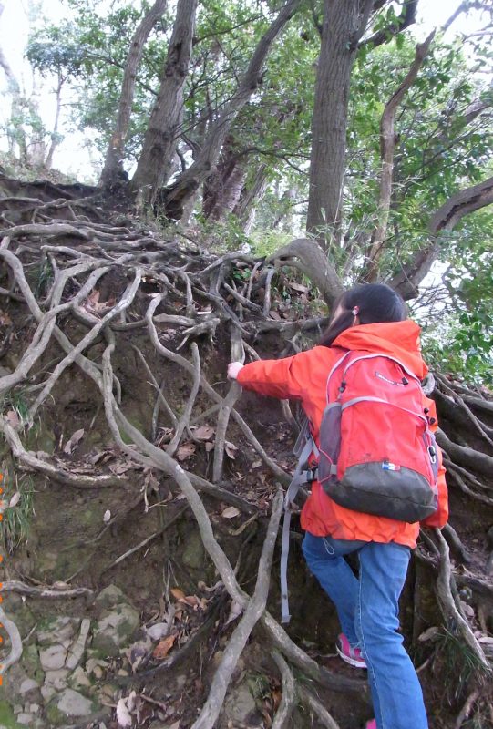 木の根っこがむき出しになった箇所がコース上にはときおり現れます。登りはしっかりとした根っこをつかんでジャングルジムのように、下りは根の上に足をおかないように後ろ向きで下らせます。その際は必ずいっしょに、または下からサポートしましょう