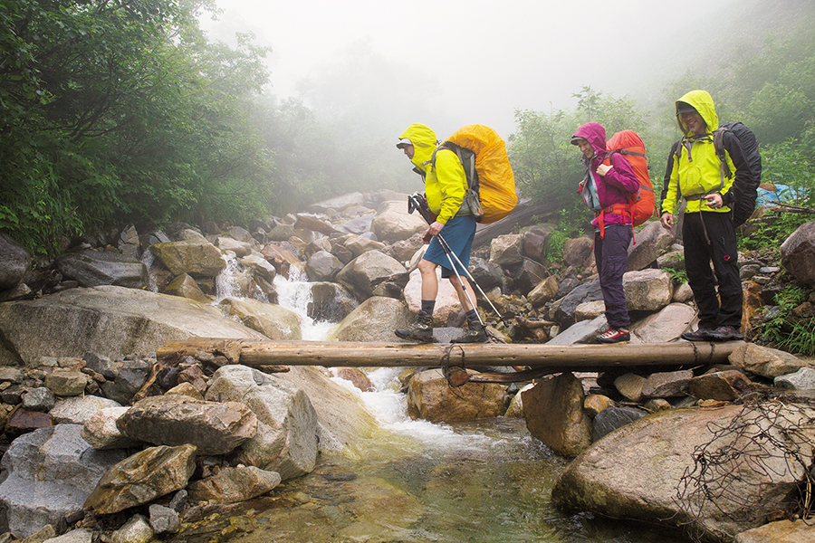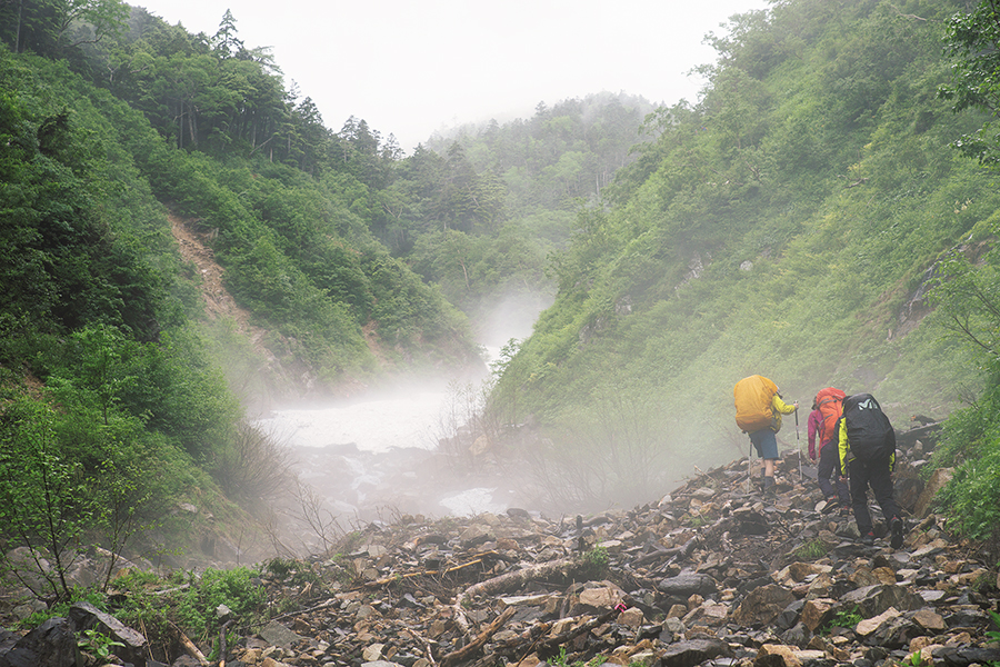 笹原沢との出合で休憩をしていたときだった。僕は、いっしょに歩いていた野崎真助さんと真希さん夫妻にそう告げると、レインジャケットのフードをかぶった。雨足が強くなってきたといっても、森のなかである。レインパンツは履かずに、ふたたび歩き出すことにした。