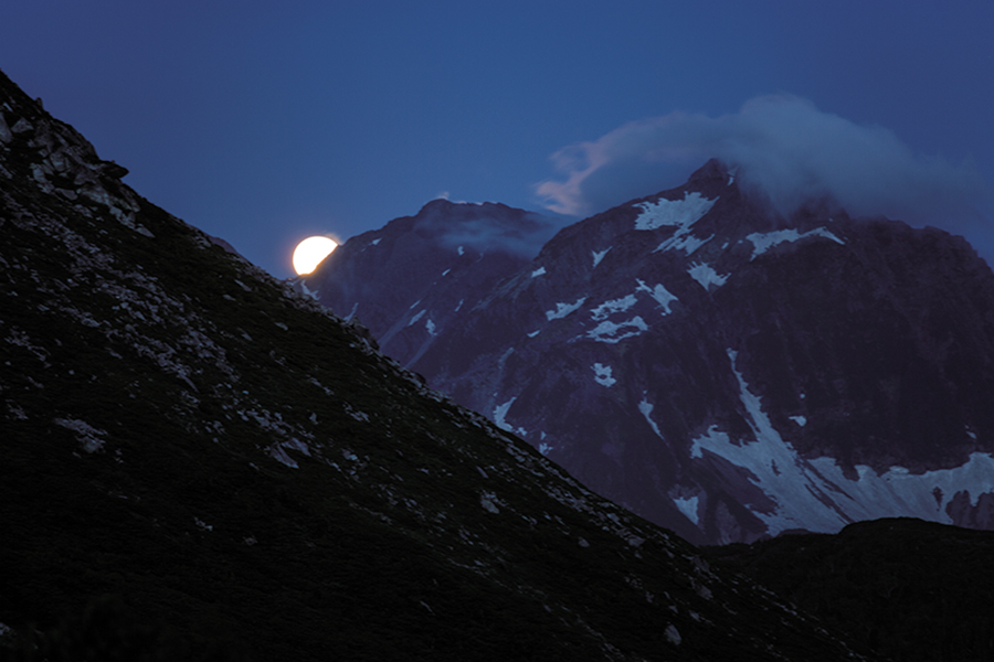 きっと分厚い雲に覆われているのだろう。そんな想像をしながら外を見渡す。すると、雲ひとつない紺碧の空が広がっていた。登山靴を履いてテントから飛び出すと、穂高連峰の横から、満月がひょっこりと顔を出している。僕よりも早くに起きていた真助さんたちも、その景色に見とれていた。