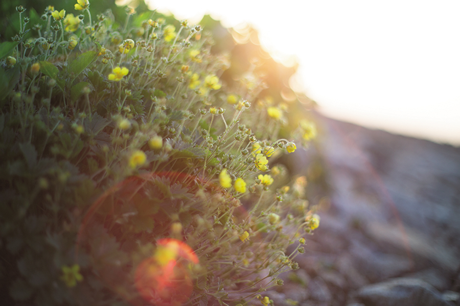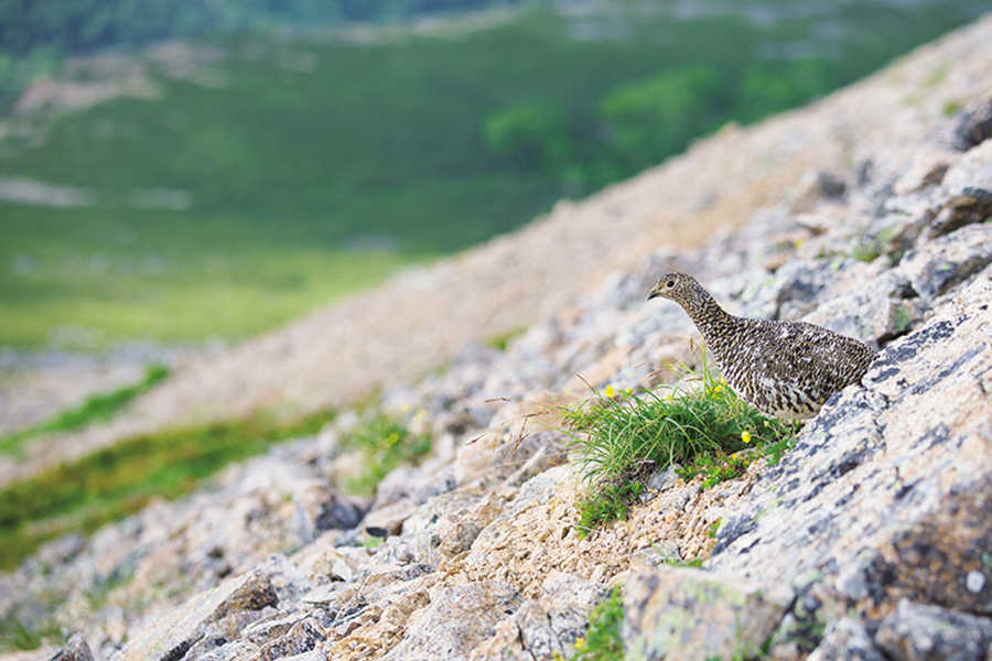 遠景の山肌には、まだ多くの雪渓が残っている。登山道の周囲では、色とりどりの草花が咲き乱れ、チクチクと小鳥の鳴き声がこだまする。斜面の上のほうに目をやると、そこには雷鳥のひなが大慌てで親鳥を探していた。クゥクゥという鳴き声のもとをたどると、すぐ足元に親鳥がいた。
