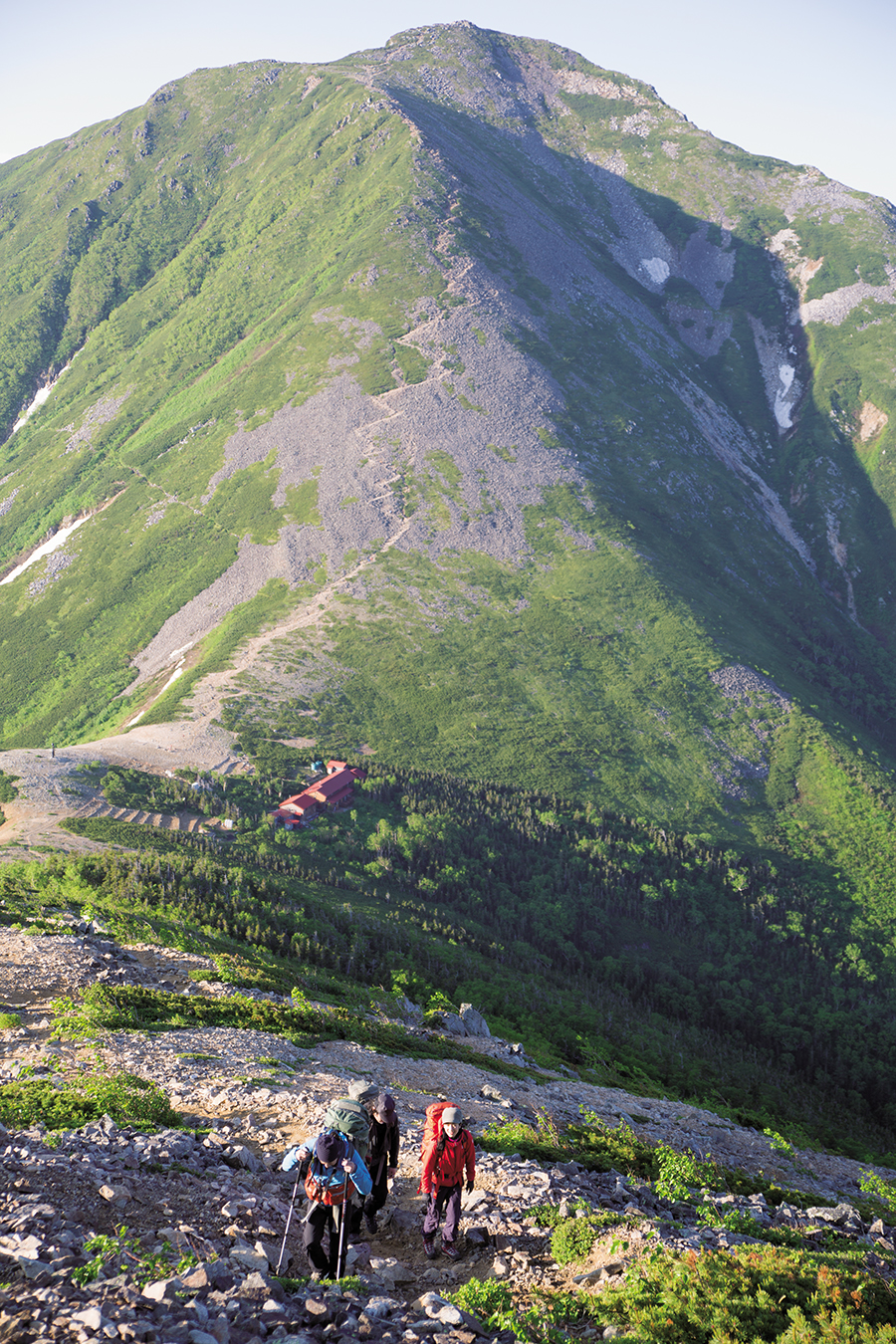 眩いばかりの朝日に照らされて、朝いちばんの急登を登って高度を上げていく。すると、山の陰に隠れていた槍ヶ岳の姿があらわれた。