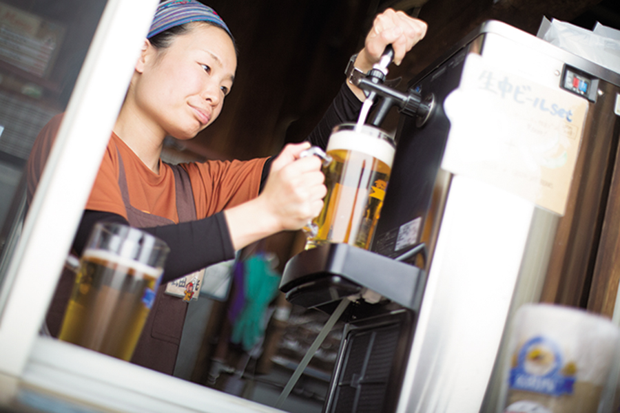 大、中、小のグラスジョッキが並べられた売店の前で「うーん」と悩んでいた真助さんに、「大、いっちゃいますか」と肩を押す。