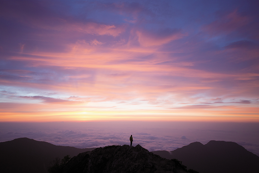 翌日の朝、テントから抜け出して周囲を見渡すと空が真っ赤に染まっていた。時刻は午前4時。眼下に見えるはずの街並みは雲海に遮られていて、その隙間から朝日が昇ろうとしていた。空の上のほうは、まだ薄暗い紺碧色に覆われている。すでに幾人かの登山者が三脚を立てて、その光景を写真に収めようとしている。