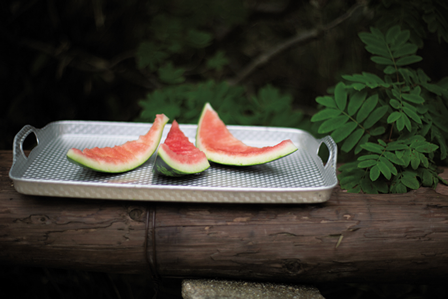 途中の合戦小屋では、名物の冷えたスイカをいただき、少し長めの休憩とした。高度を落としていくにしたがって森が深くなり、木床は苔むしていった。そうこうしていると雨が降り始め、レインジャケットを羽織った。気温も上昇して、蒸し暑さが増していった。