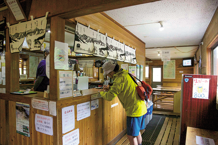③テントを設営する前に常念小屋で受付をする。飲料水は有料なので、テント場に向かう前に小屋で入手しておくといいだろう。