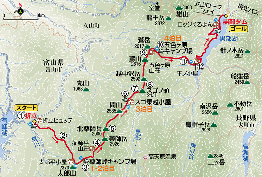 技術的に難しい箇所はないが、体力と気力を要する通称「ダイヤモンドルート」薬師峠~五色ヶ原間(コースタイム約12時間)をがんばれば、2泊3日で踏破することもできる。