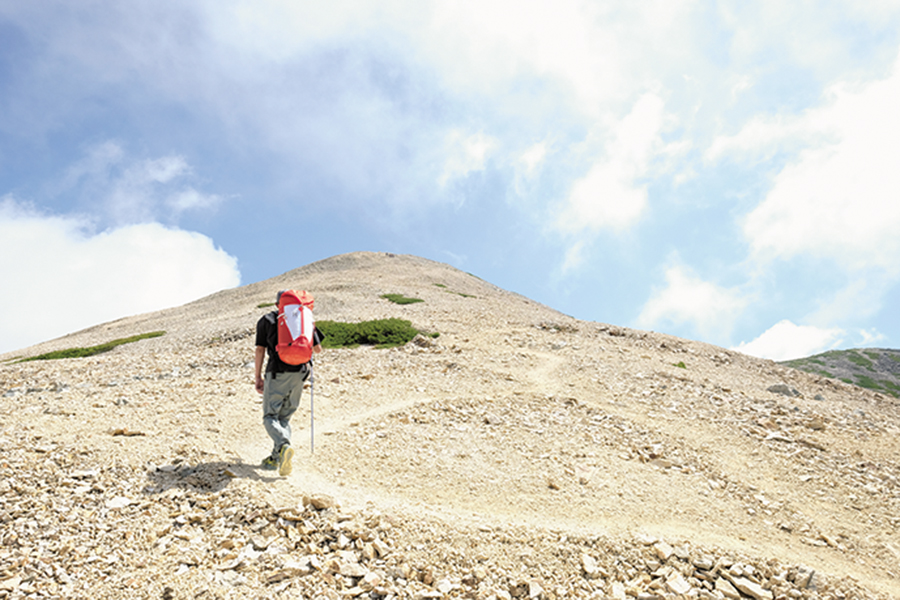 ④薬師岳山荘の先はザレた登りが続くが、道自体は歩きやすい。山荘から山頂まで約1時間。