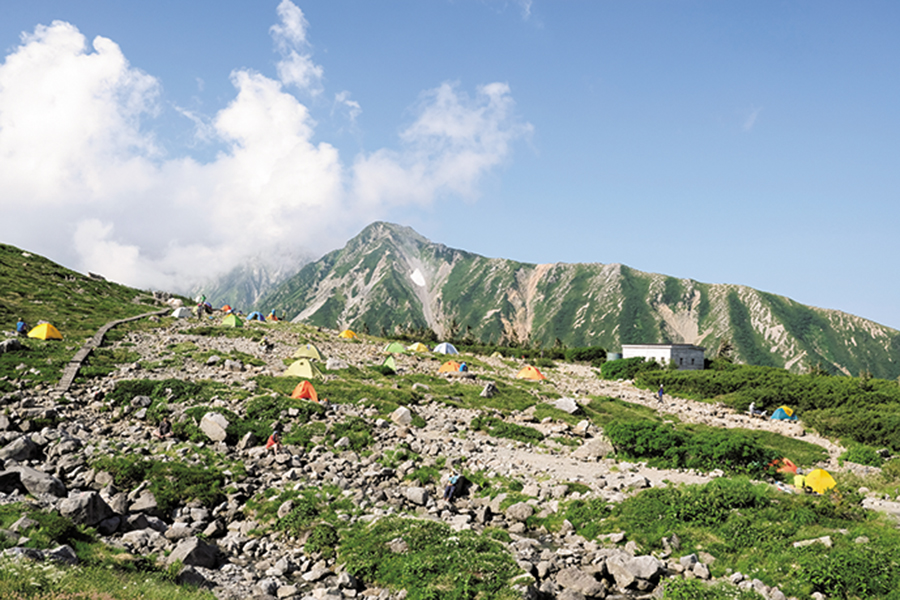 ⑩高山植物があふれる五色ヶ原のテント場。小屋からは少し下るので、事前受付を忘れずに。