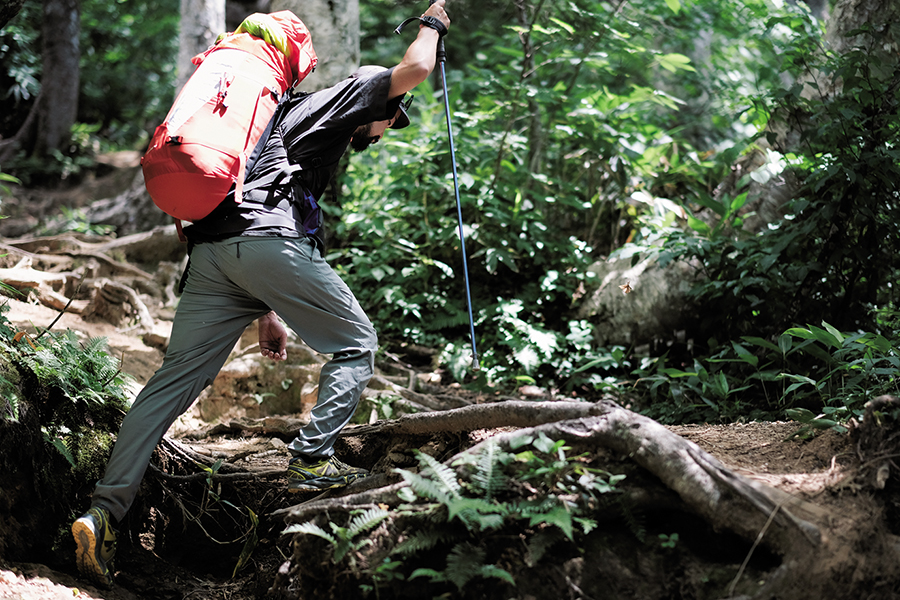 また、この稜線上は、せっかく標高を稼いでも、きっちり下って、再びしっかり登り返すアップダウンの連続。技術面よりも、体力と強いメンタルが試されるようなトレイルが続く。スゴ乗越からスゴノ頭の急登を経て、さらに一気に下った鞍部から再び急登を登り返す越中沢岳周辺が、このルートの精神的核心部だろう。有料の巻道ができるなら、喜んで利用したいくらい。
