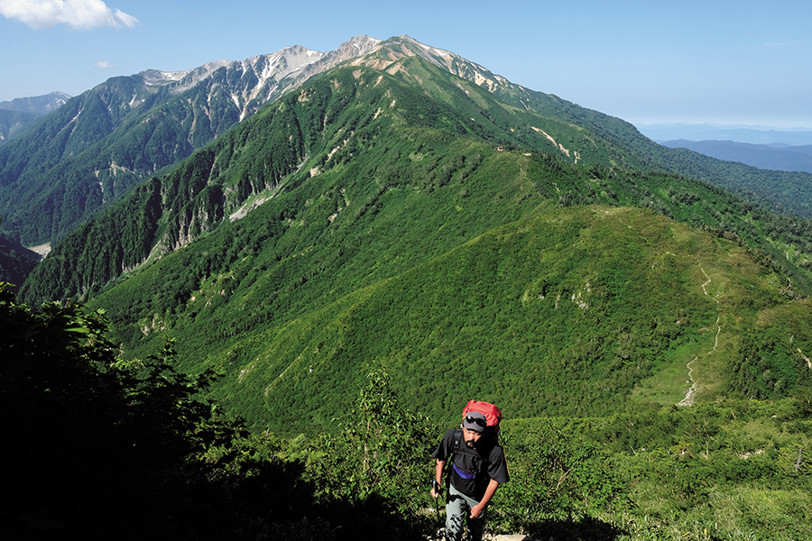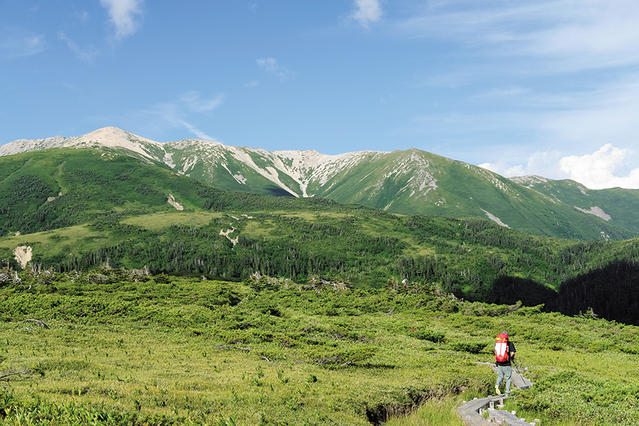 しかし、巨大なブナやミズナラが熱気を閉じ込めていた原生林を抜けると、景色は一変する。視線の先には、広々としたたおやかな尾根に登山道が延び、左手には巨大な薬師岳の塊が出迎えてくれた。