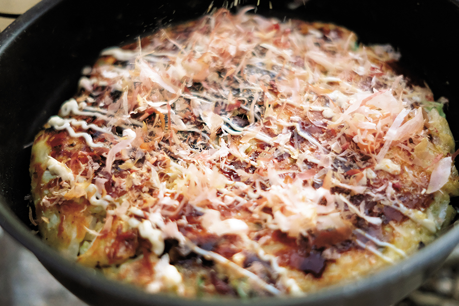 初日はキャベツや卵を贅沢に使って、お好み焼きをたっぷりと。材料をすべて袋に入れてモミモミし、フライパンで焼くだけの簡単レシピ。