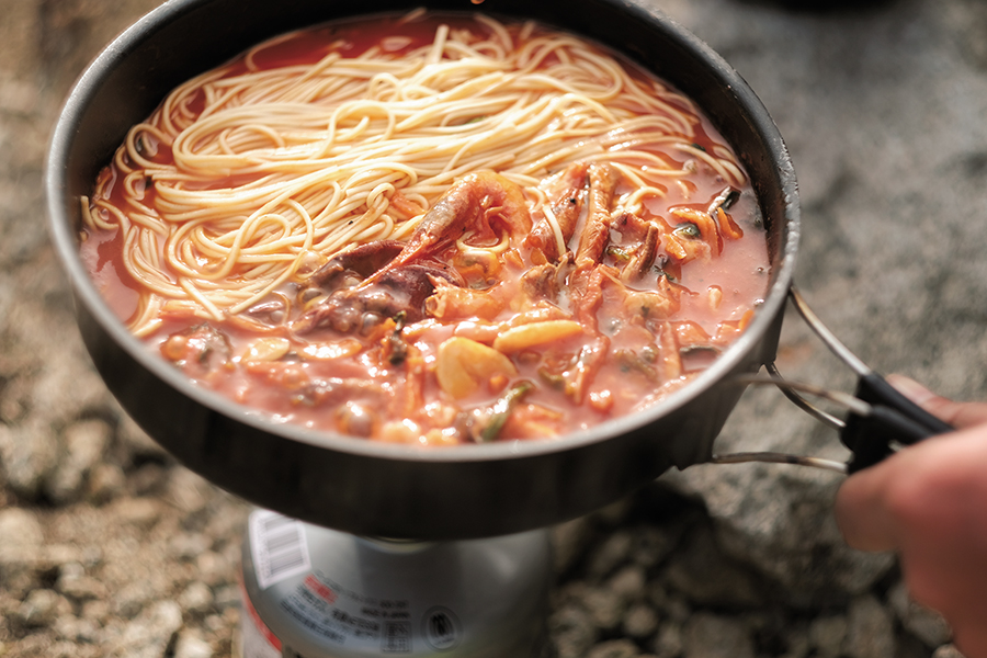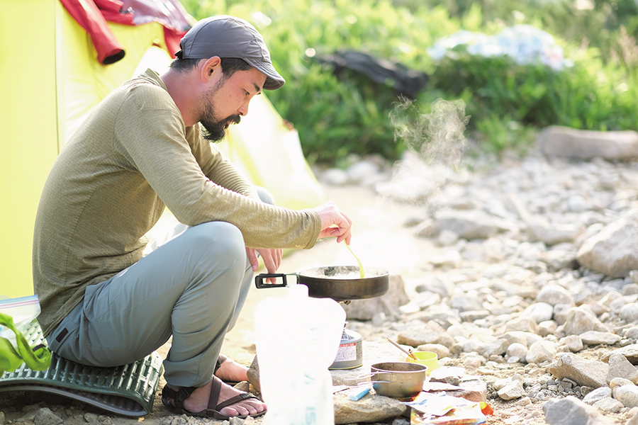 当時と比べてギア全般がコンパクトになった恩恵もあり、無理に削らなくても、いまは4泊5日のテント泊装備は40ℓサイズに十分収めることができる。そして今晩もテントに戻れば、おいしい食事と冷え冷えのビールが待っている。