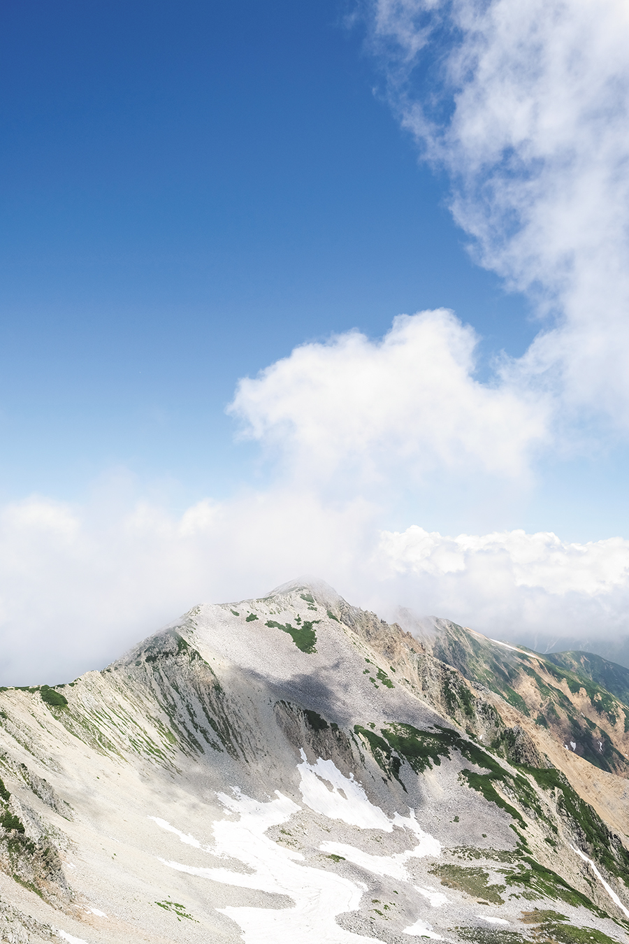 遠くから見ても薬師岳の大きさは一目瞭然だが、近づくにつれ、その大きさがより実感できる。聳え立つというより、横たわるという表現がしっくりくる巨大な山塊は、3つの広大なカールを内包している。残雪が斜面に描く真っ白なマダラ模様と、溶け出した水が山肌に染み出した跡をなぞるような、高山植物の緑が織りなすコントラストは、じつに見事だ。