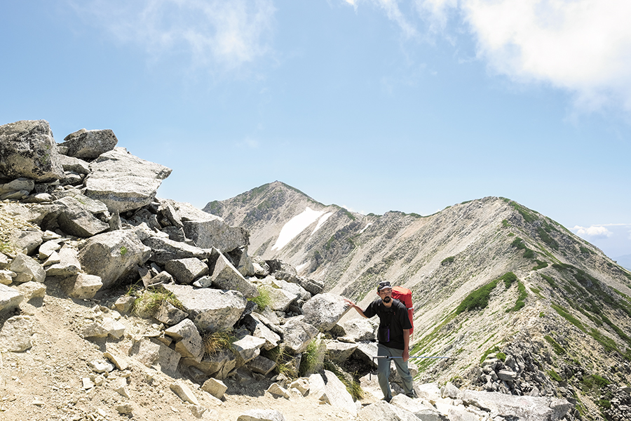 薬師岳から先はひたすら雲上の稜線歩きが続く。技術的に特筆すべき危険箇所はなく、ずっとすばらしい景色が続くのだが、エスケープルートも直射日光からの逃げ場もない。直射日光対策とこまめな水分補給、天気次第では進むか戻るかの状況判断が必要不可欠だ。