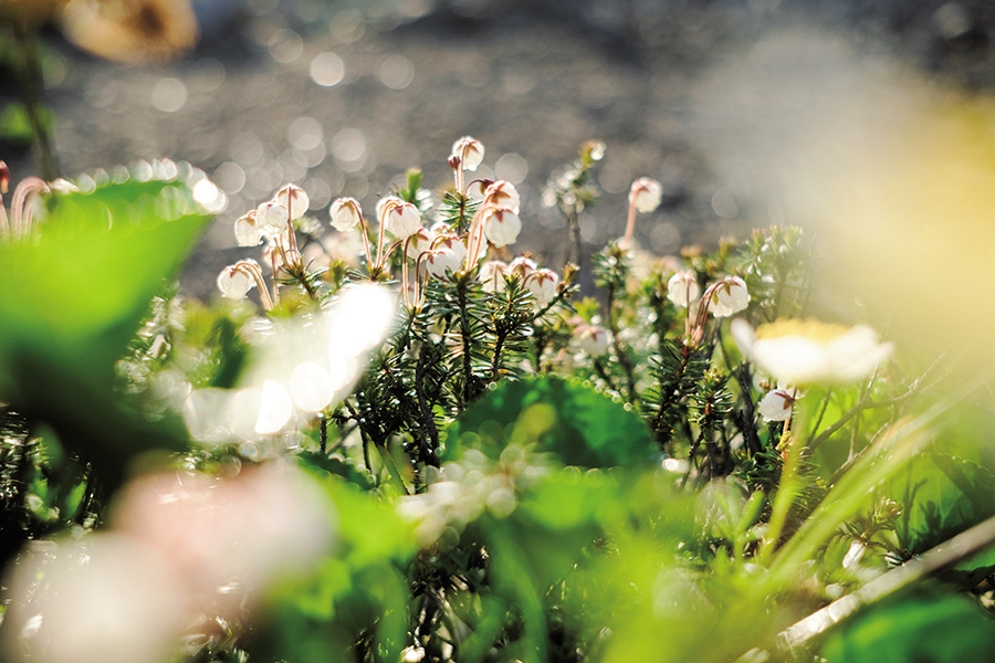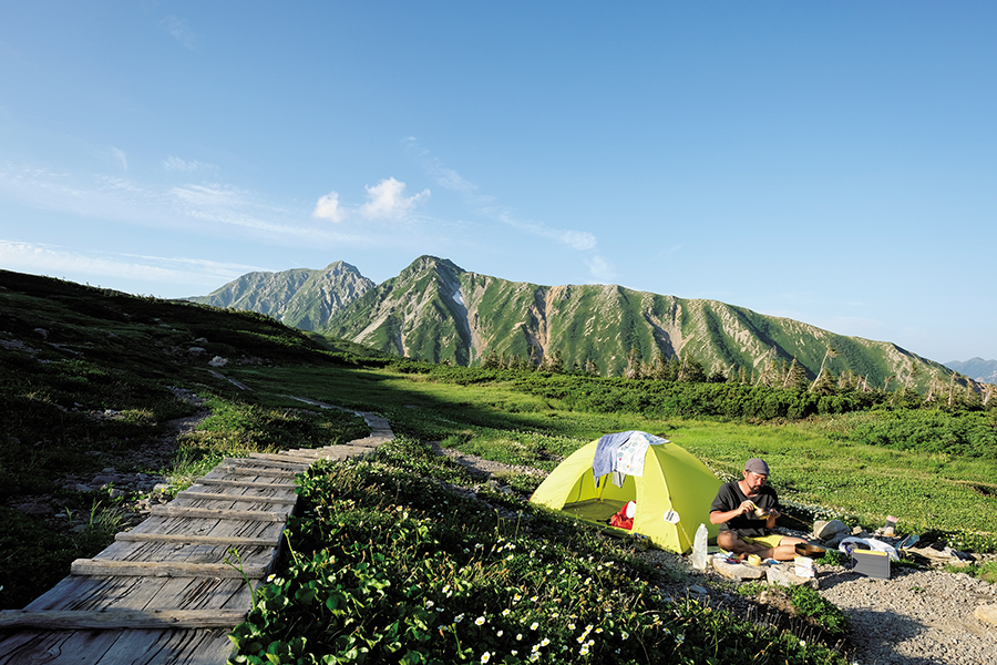 最後の宿泊地に設定した五色ヶ原キャンプ地は、灼熱の稜線歩きでお腹が一杯になったあとに待つ最高のデザートである。ここに泊まるためだけに、足を運んでも損はない。なにがすごいって、まずテント場中にチングルマやハクサンイチゲ、コバイケイソウをはじめとする高山植物が所狭しと咲き乱れていること。とくに、夕方や朝のドラマチックな光に、チングルマの綿毛が照らされて輝く時間帯の美しさは、僕の稚拙な日本語力じゃうまく説明できない。