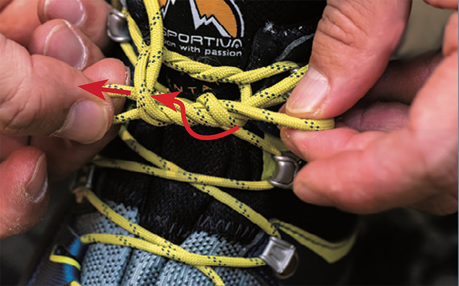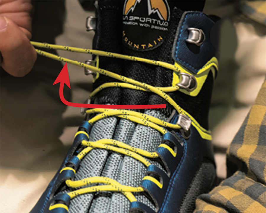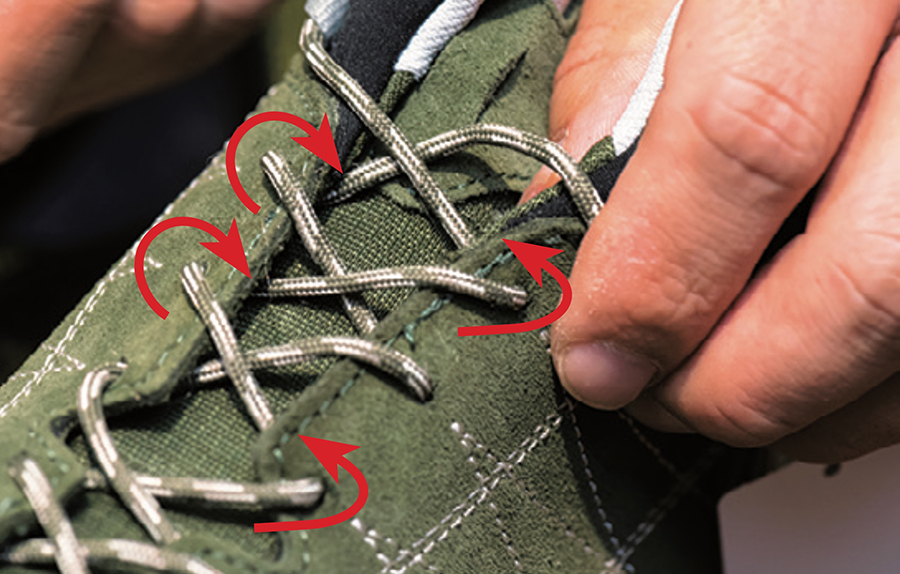 おもにハイカットシューズの足首にあるフックの部分で活かせる通し方。シューレースをフックに掛けていくとき、通常なら下から上へと掛けると思うが、写真上の矢印のように上から下へと掛けていく。そうすることで抵抗がかかり、紐を引っ張る力を緩めてもある程度絞った状態でキープできるので絞りやすくなる。