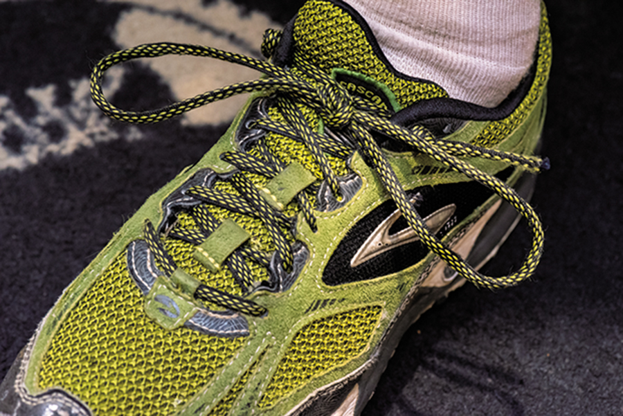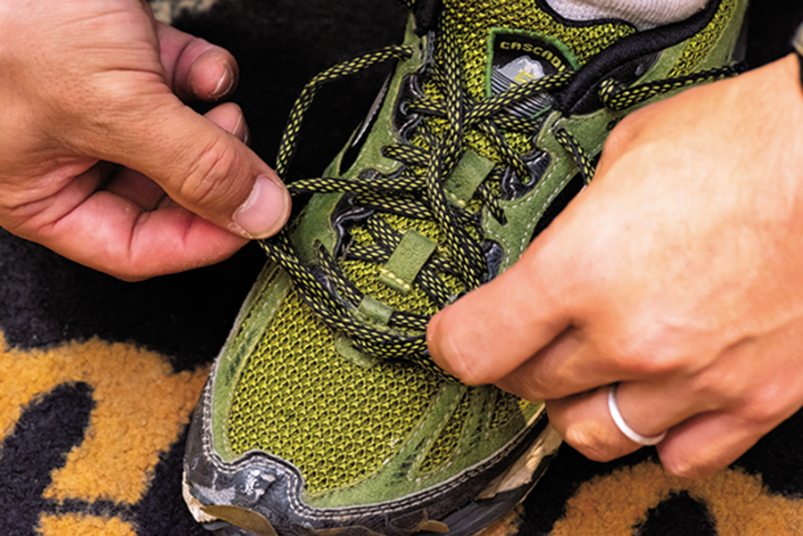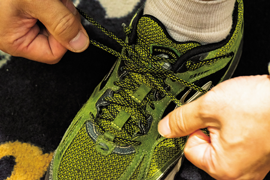 シューレースで、上から下へ通しているものと、下から上へ通しているものがある。この違いに理由はあるのか。吉野さんに伺ってみた。「上から下のほうが抵抗がかかって緩みづらく、下から上だと緩みやすいのではないでしょうか。最初にセットされた通し方はメーカーの違いによるものかもしれません」。