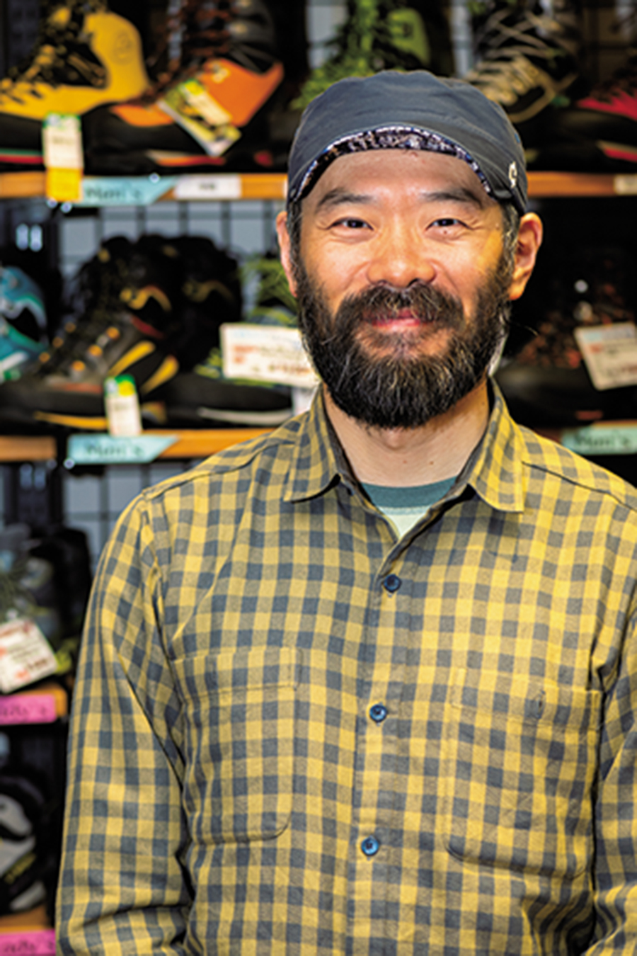 ヨシキ&P2スタッフ。あらゆる登山道具に詳しく、お客さんに親身になって説明してくれる。登山やクライミング、BCスキーなどなんでも得意。