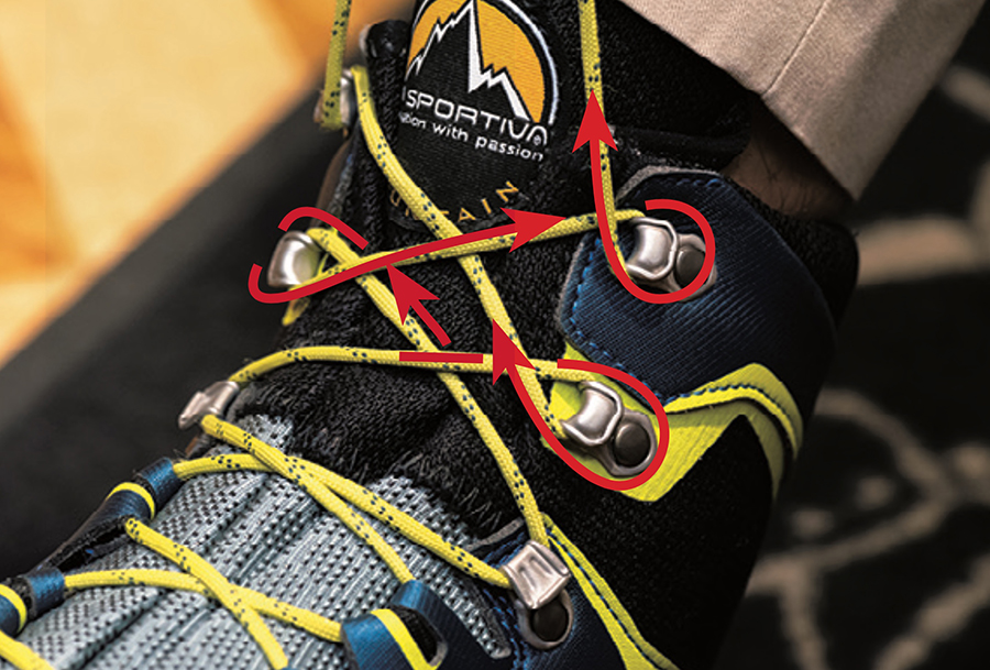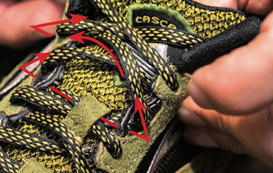 おもにハイカットシューズの足首にあるフックの部分で活かせる通し方。シューレースをフックに掛けていくとき、通常なら下から上へと掛けると思うが、写真上の矢印のように上から下へと掛けていく。そうすることで抵抗がかかり、紐を引っ張る力を緩めてもある程度絞った状態でキープできるので絞りやすくなる。