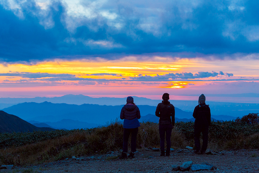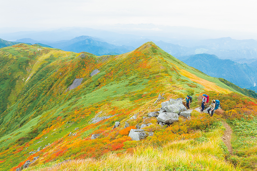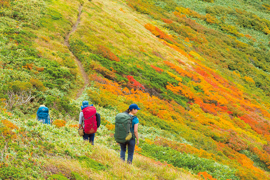 国内でも指折りの豪雪地帯だからゴールデンウィークは人の立ち入りが少ないが、残雪が消え、7月から8月になると花々が咲き競って大規模なお花畑が方々に出現。この期間が夏山のベストシーズンだ。8月をすぎると登山者は徐々に減るが、9月下旬から10月初旬ごろあたりまで静かな紅葉シーズンが稜線上に訪れる。