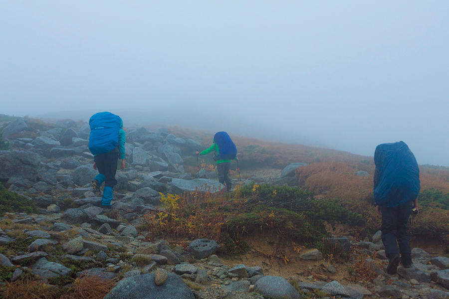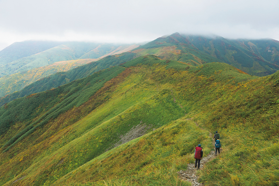 下山路を突き進む彼女たちを追いながら、もう一度飯豊の稜線を振り返った。いまだ濃い霧に包まれていたが、だれに誇るわけでもなく、ただ静かに草木が葉を染めているのだと思うと、切なく、そして胸が詰まるような思いがした。