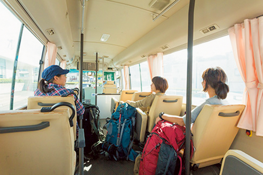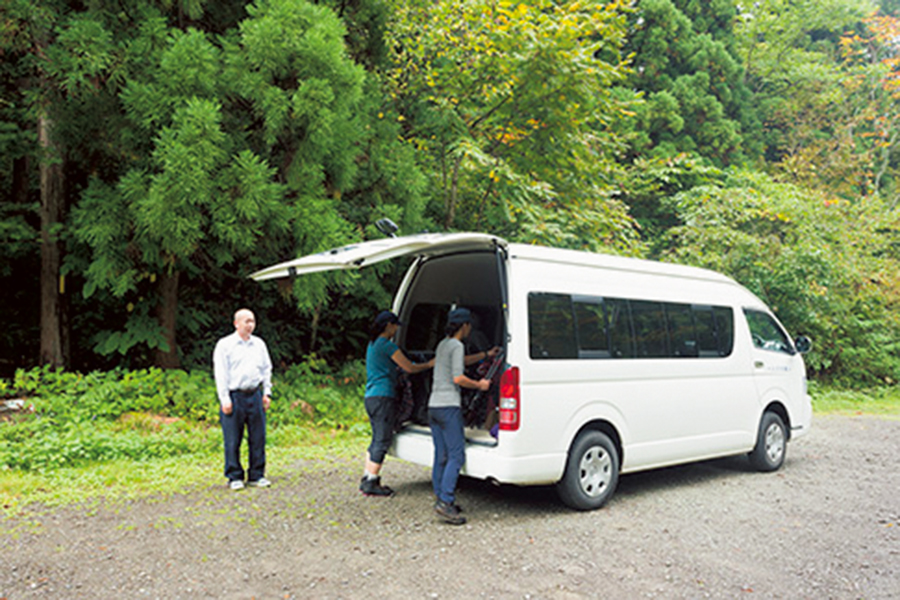 ①JR米坂線小国駅から飯豊山荘までのバスは8月31日まで。それ以外の期間は手前の梅花皮荘が終点。約1時間、運賃は¥700。