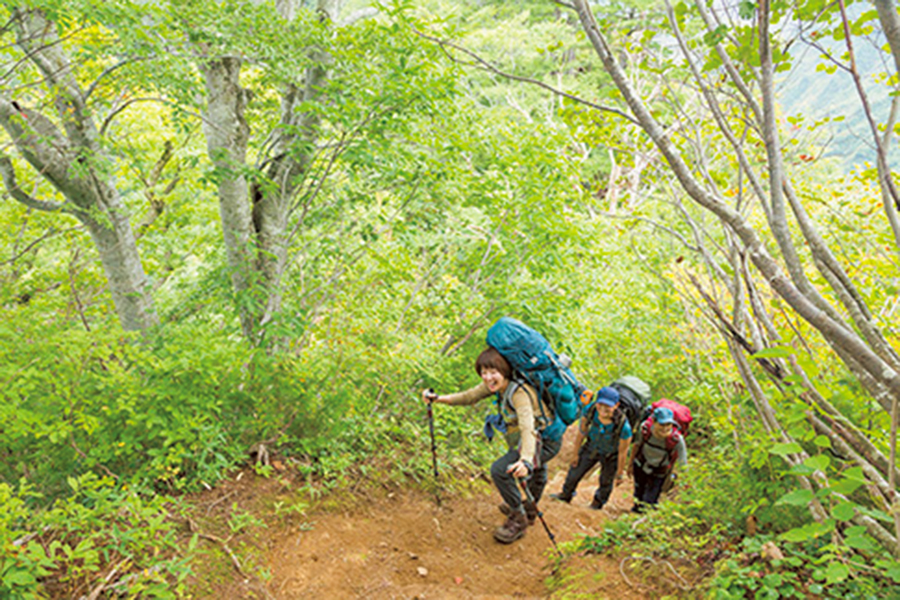 ②どこから入山しても初日は急登を強いられるのが飯豊。丸森尾根も例外でなく、下りのほとんどない一直線の登りだ。気合いあるのみ!