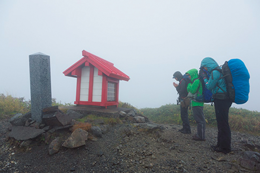 ⑤初日夜から天候が崩れ、翌朝は雲のなか。門内岳の山頂に立つ大山積の祠で道中の天候回復を祈ってみる。果たしてその成果は……!