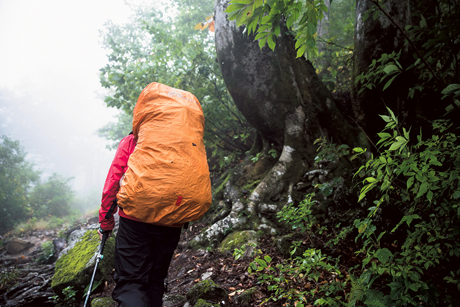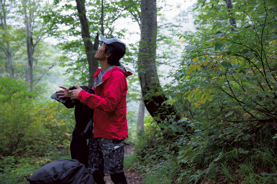 レインウエアを着るべきかどうか迷うような小雨のなかを歩いていく。東北の山、それも日本海側を代表する景色ともいうべきブナの林がきれいだ。朝日連峰の大半を占める山形県の隣に位置する宮城県出身の僕にもなじみがあり、じつに落ち着いた気分になれる。
