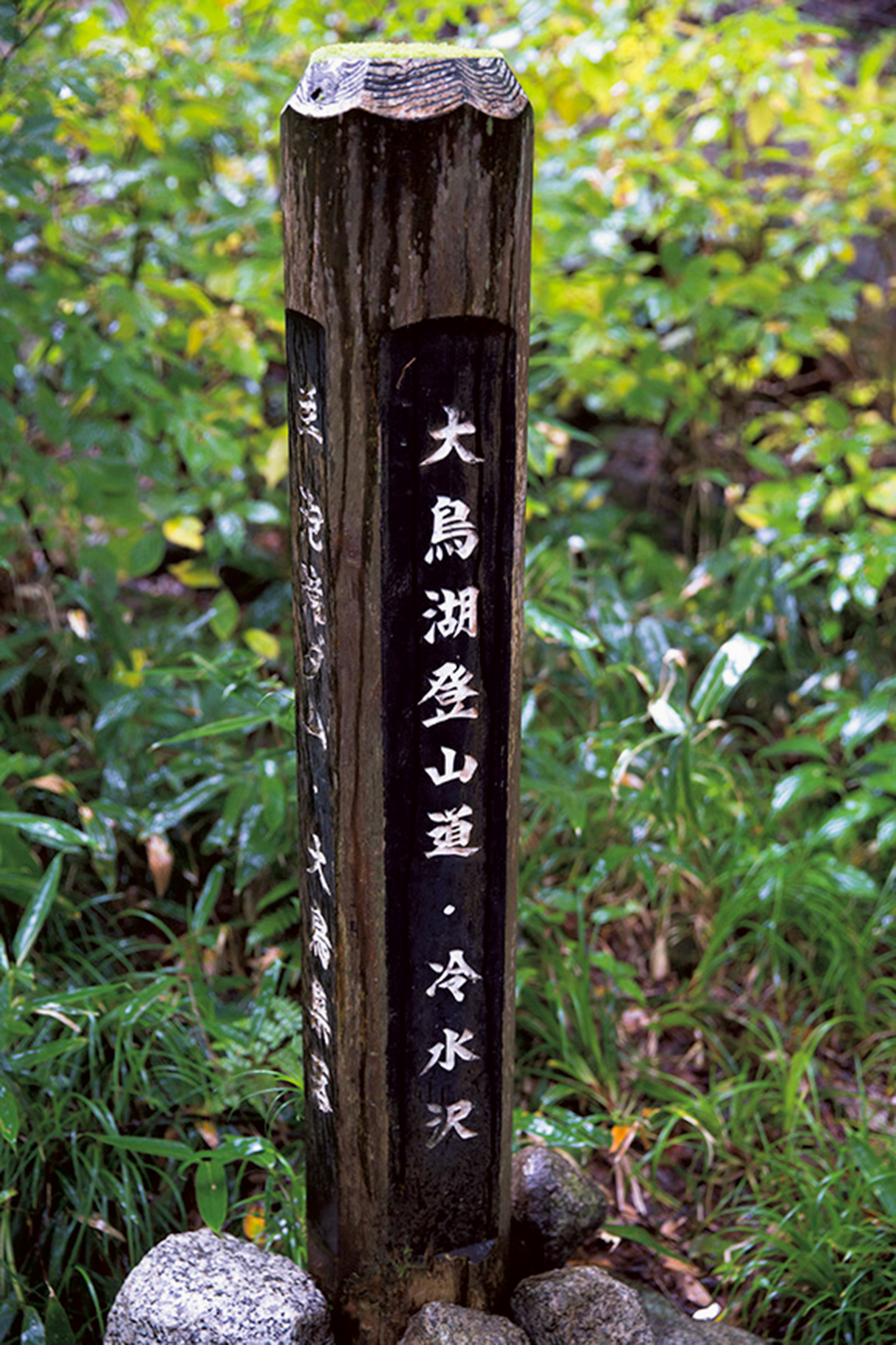 「大鳥池」ではなく、「大鳥湖」登山道と表示された道標。冷水沢の吊り橋前に立っていた。